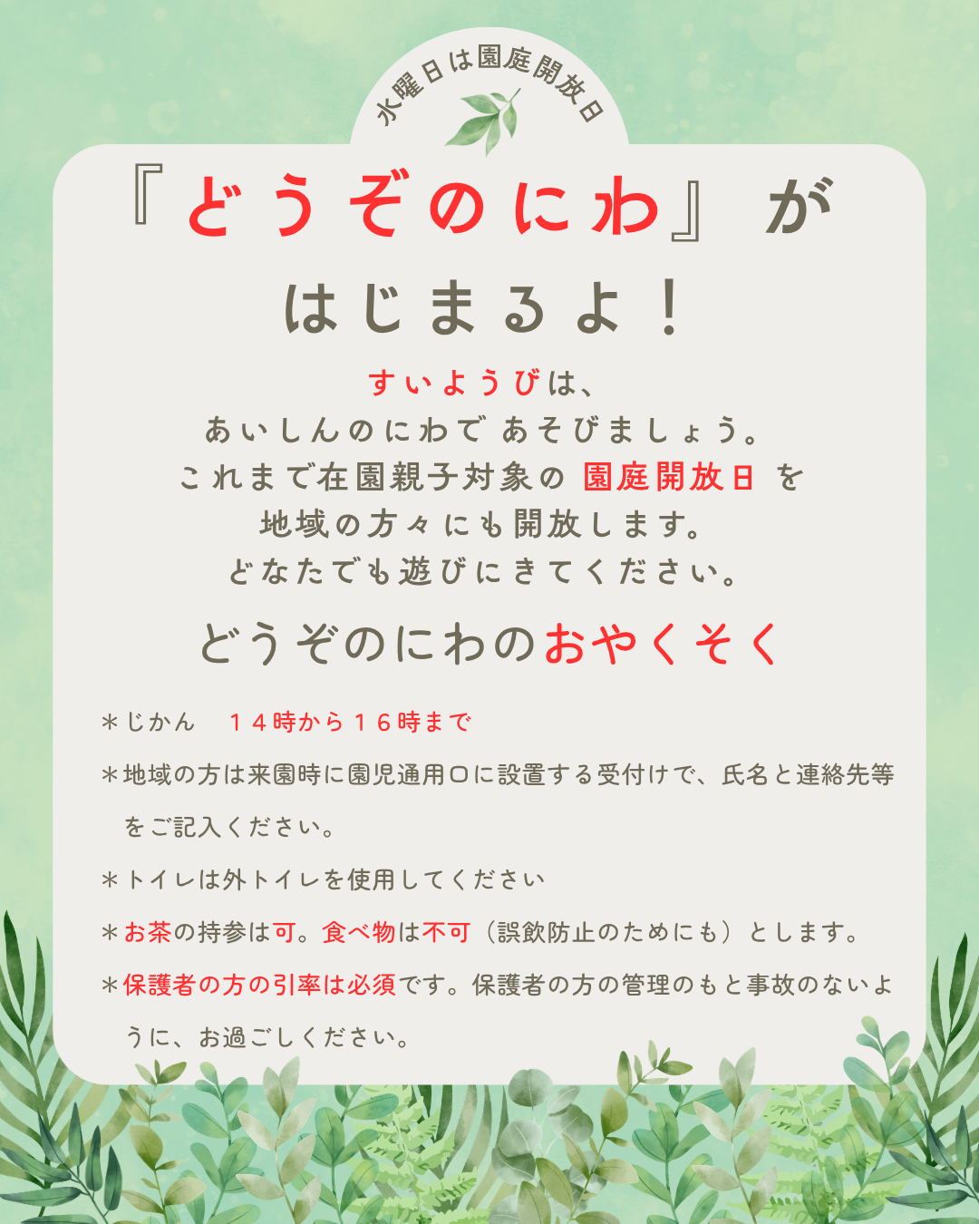 これまで在園親子対象の 園庭開放日を 地域の方々にも開放します。